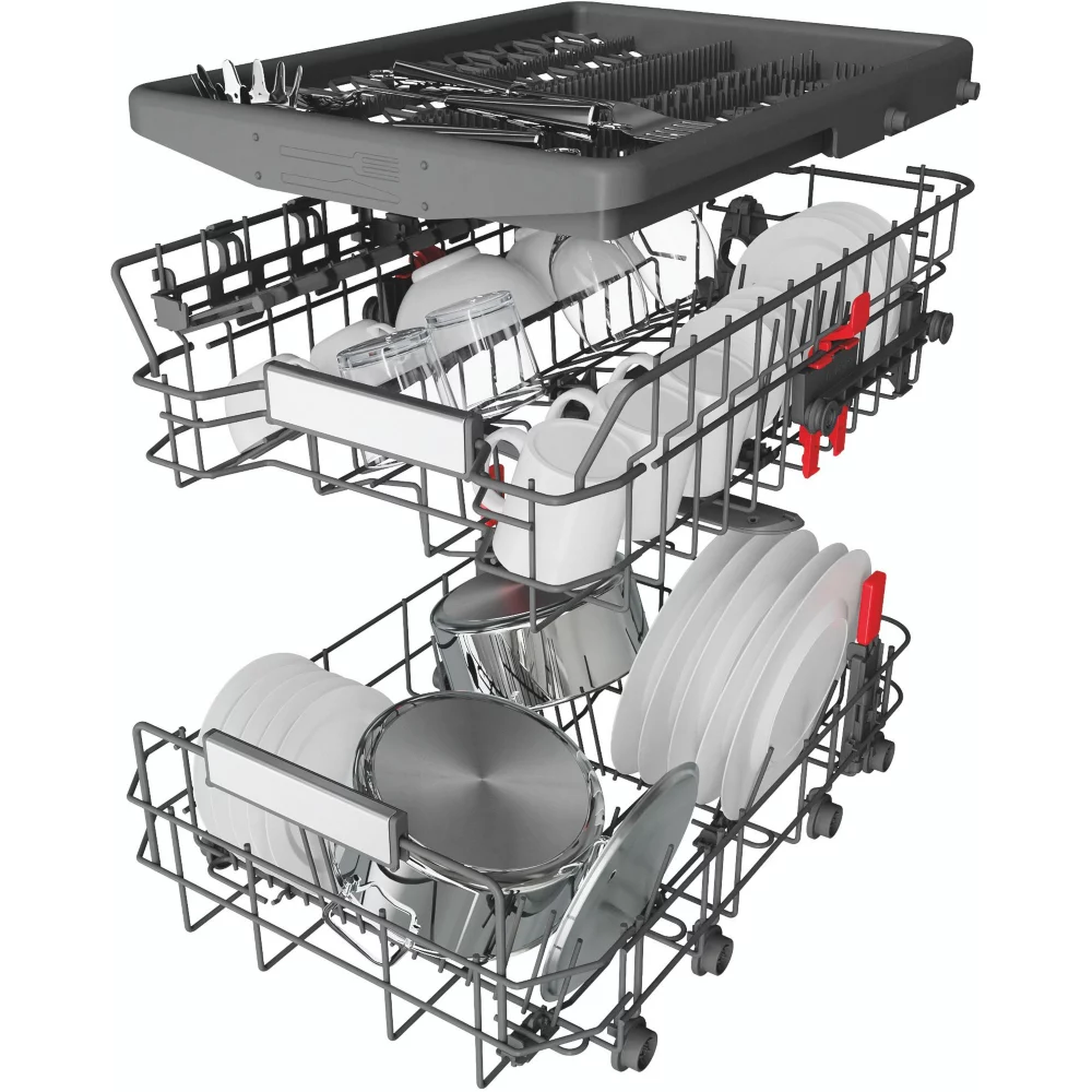- Avantage du panier supérieur réglable en hauteur : Permet de laver des plats de grandes tailles ou de grands verres à pieds.