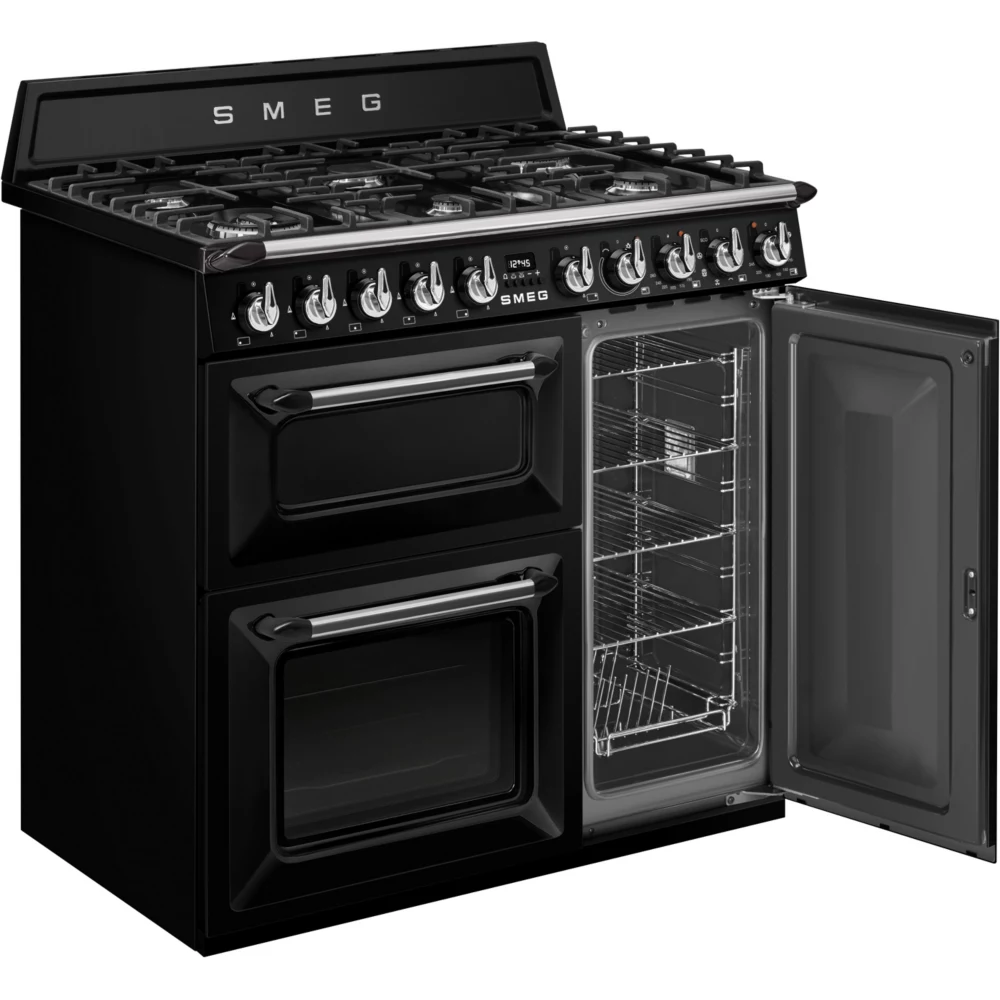 Le Piano de cuisson gaz SMEG TR93BL, avec son esthétique Victoria et ses finitions raffinées, est un véritable bijou pour toute cuisine cherchant à allier le charme du rétro au confort technologique actuel. Sa couleur noire élégante, ses manettes Smeg Victoria en inox brossé et son logo années 50 en relief confèrent à ce modèle un look intemporel. Doté d’un plan de cuisson gaz de 90×60 cm, il offre une grande surface pour préparer plusieurs plats simultanément. Avec six brûleurs de différentes puissances, allant de l’auxiliaire 1.00 kW au brûleur ultra-rapide de 4.20 kW, ce piano de cuisson est parfait pour mijoter, bouillir ou saisir avec précision. Les grilles en fonte assurent une stabilité parfaite des casseroles, et l’allumage intégré aux manettes garantit une mise en route rapide et sécurisée grâce au thermocouple.