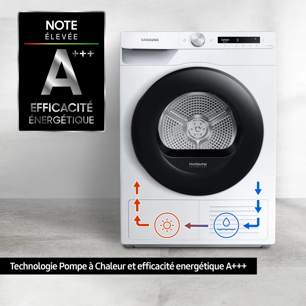 Rรฉalisez des รฉconomies tout au long de lโannรฉe grรขce au sรจche-linge SAMSUNG DV80T5220AW ! En plus de son systรจme de pompe ร chaleur, vous bรฉnรฉficierez deย la technologie de pointe Heat Pump, qui recyclera lโair chaud et le chauffera ร une tempรฉrature infรฉrieure ร un sรจche-linge classique, pour prendre soin de vos textiles sans alourdir votre facture dโรฉlectricitรฉ.