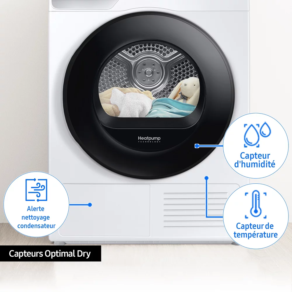 - Optimal Dry :ย lโarrรชt du sรฉchage est automatique grรขce au capteur dโhumiditรฉ, ce qui permet des รฉconomies dโรฉnergies et un plus grand soin du linge.