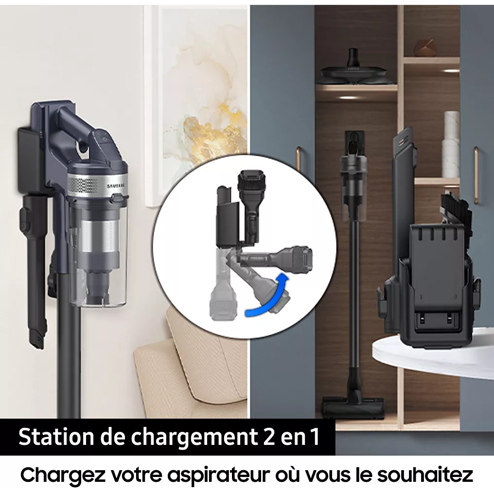 Caractéristiques complémentaires - Stockez et rechargez votre aspirateur avec plus de flexibilité grâce à la station de chargement 2-en-1. Vous pouvez la fixer au mur ou tout simplement l’utiliser indépendamment.