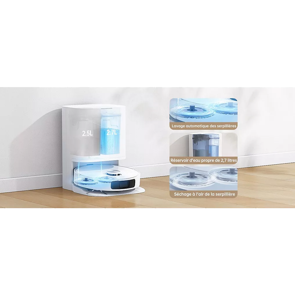 - Réservoir d’eau propre (robot) : le robot ne possède pas de réservoir d’eau, les serpillères sont humidifiées dans la station avant chaque lavage