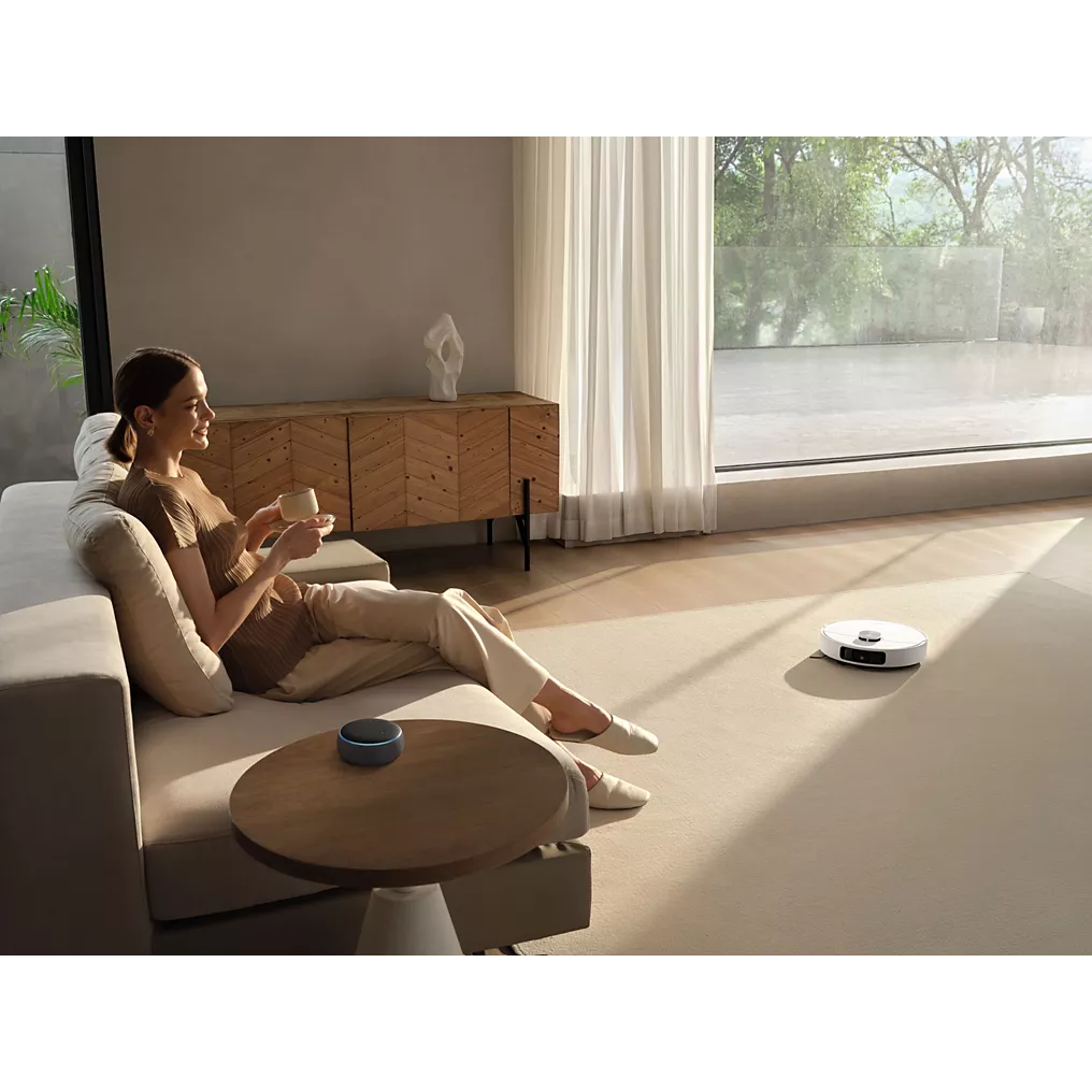 - Serpillère déportée : le robot est capable de nettoyer plus efficacement les angles et bords des murs en déployant sa serpillière vers l’extérieur.