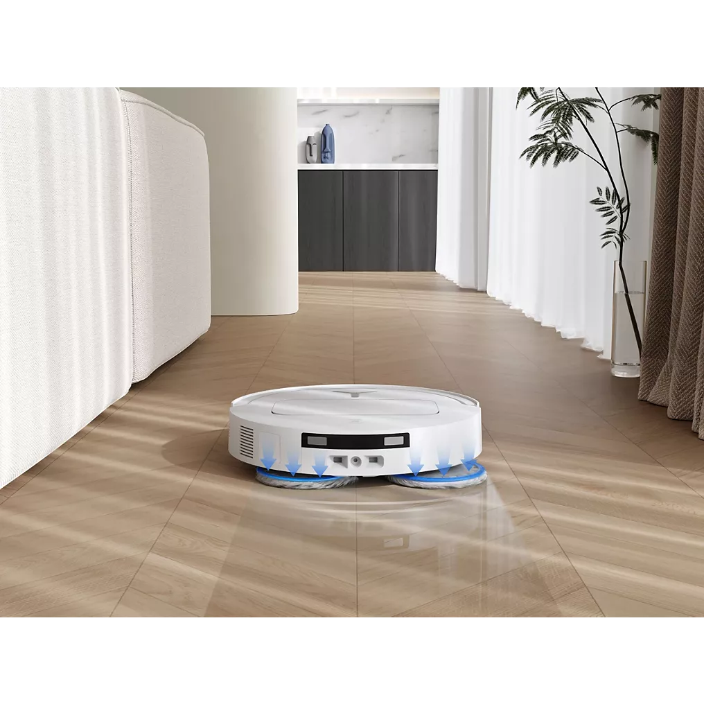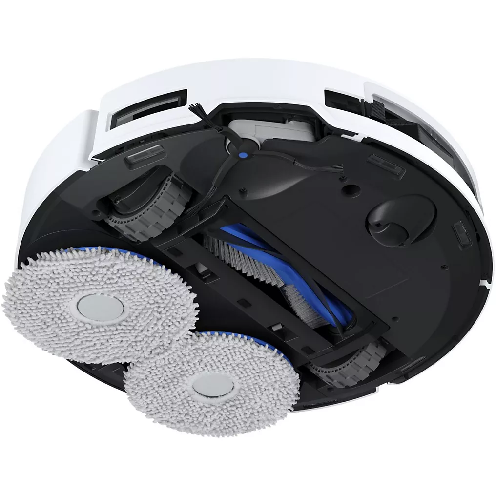 • Serpillère déportée : le robot est capable de nettoyer plus efficacement les angles et bords des murs en déployant sa serpillière vers l’extérieur.