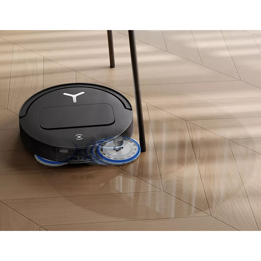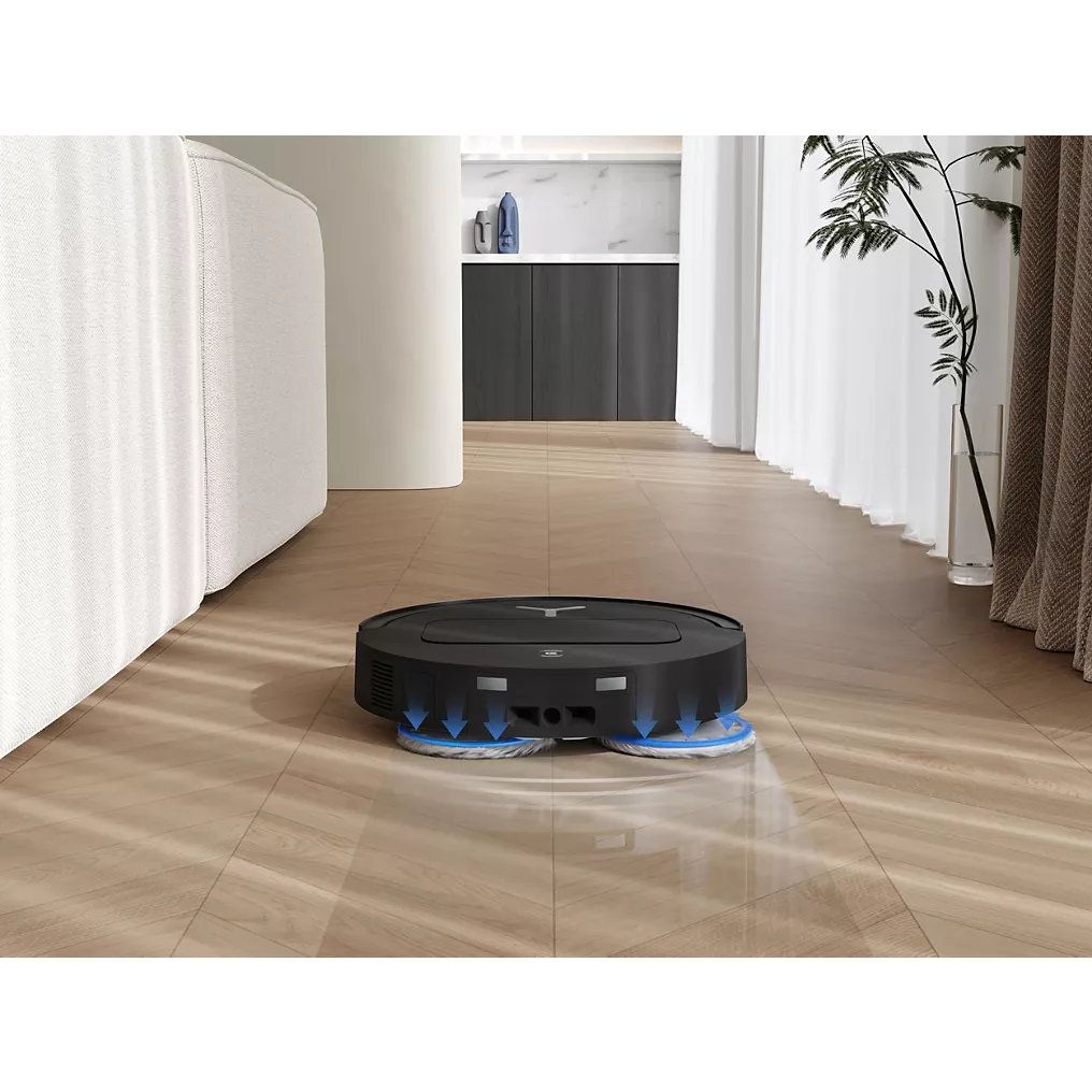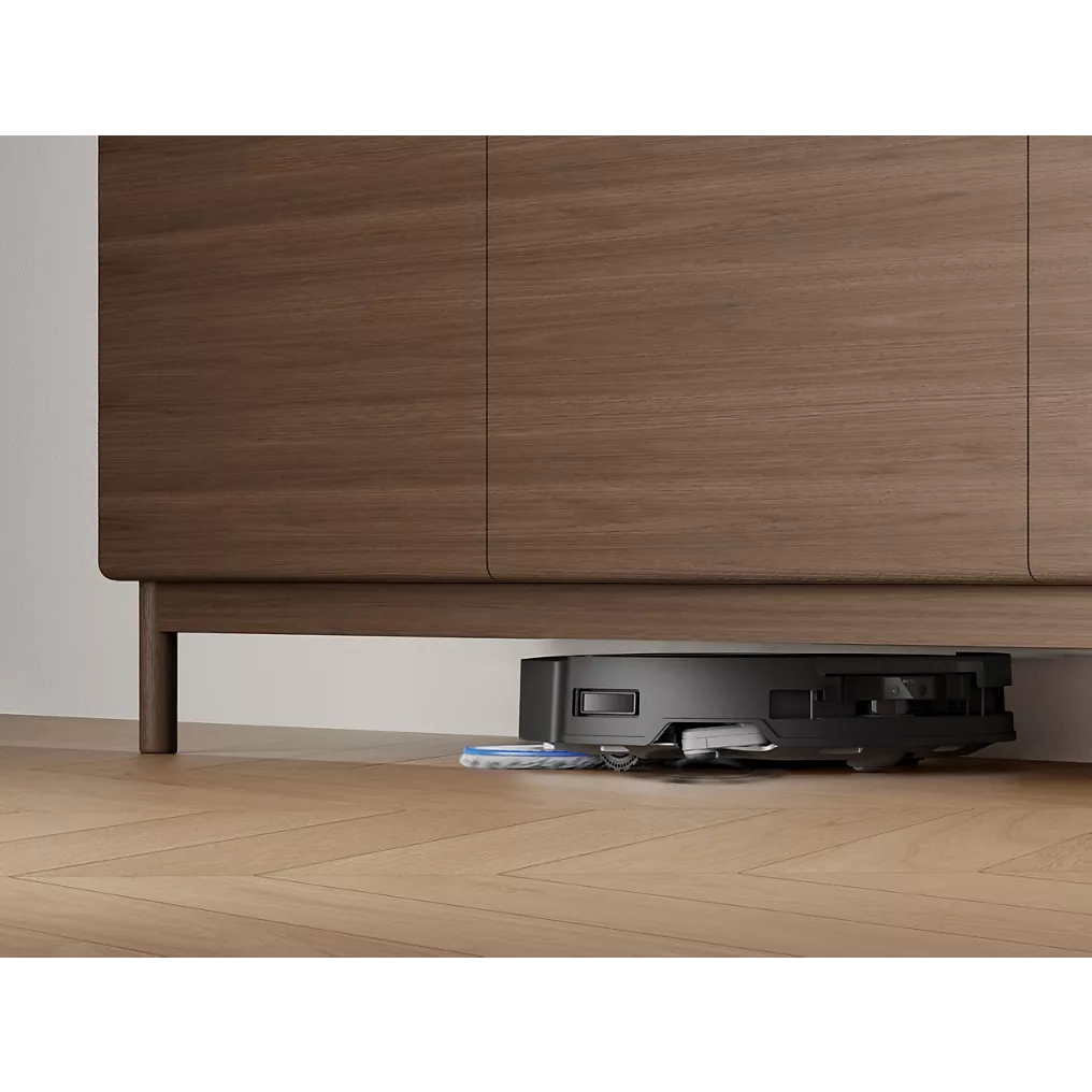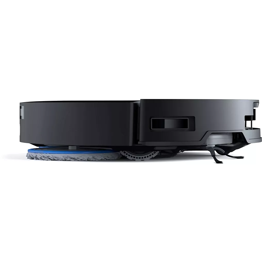- Serpillère déportée : le robot est capable de nettoyer plus efficacement les angles et bords des murs en déployant sa serpillière vers l’extérieur.