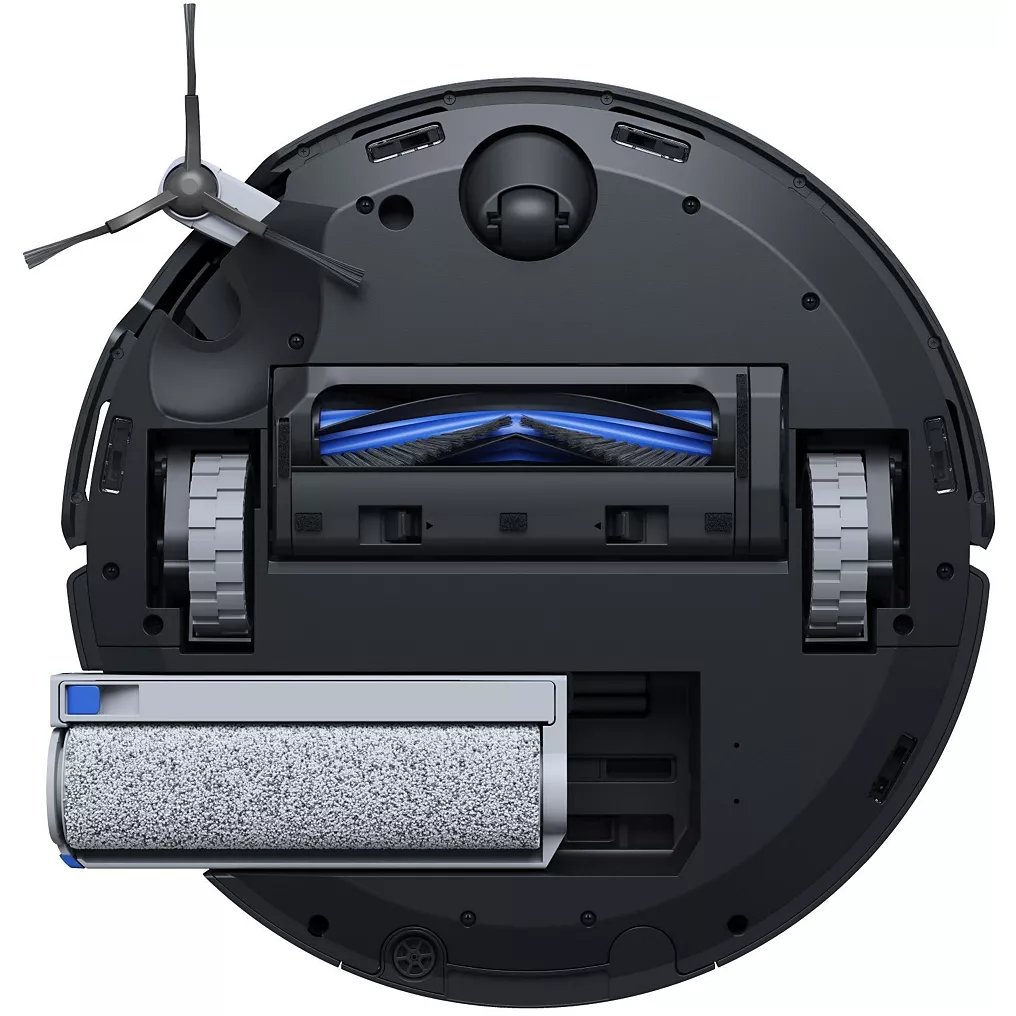 - Serpillère déportée : le robot est capable de nettoyer plus efficacement les angles et bords des murs en déployant sa serpillière vers l’extérieur.