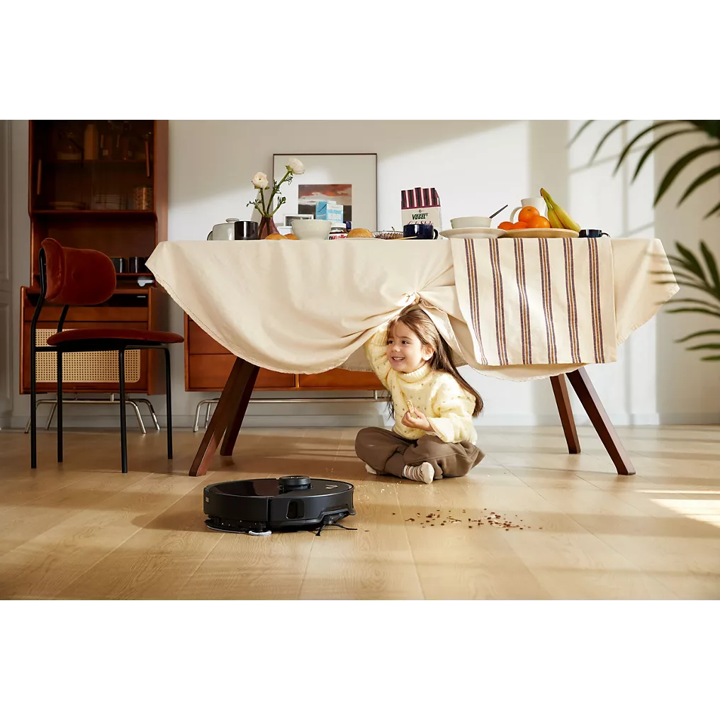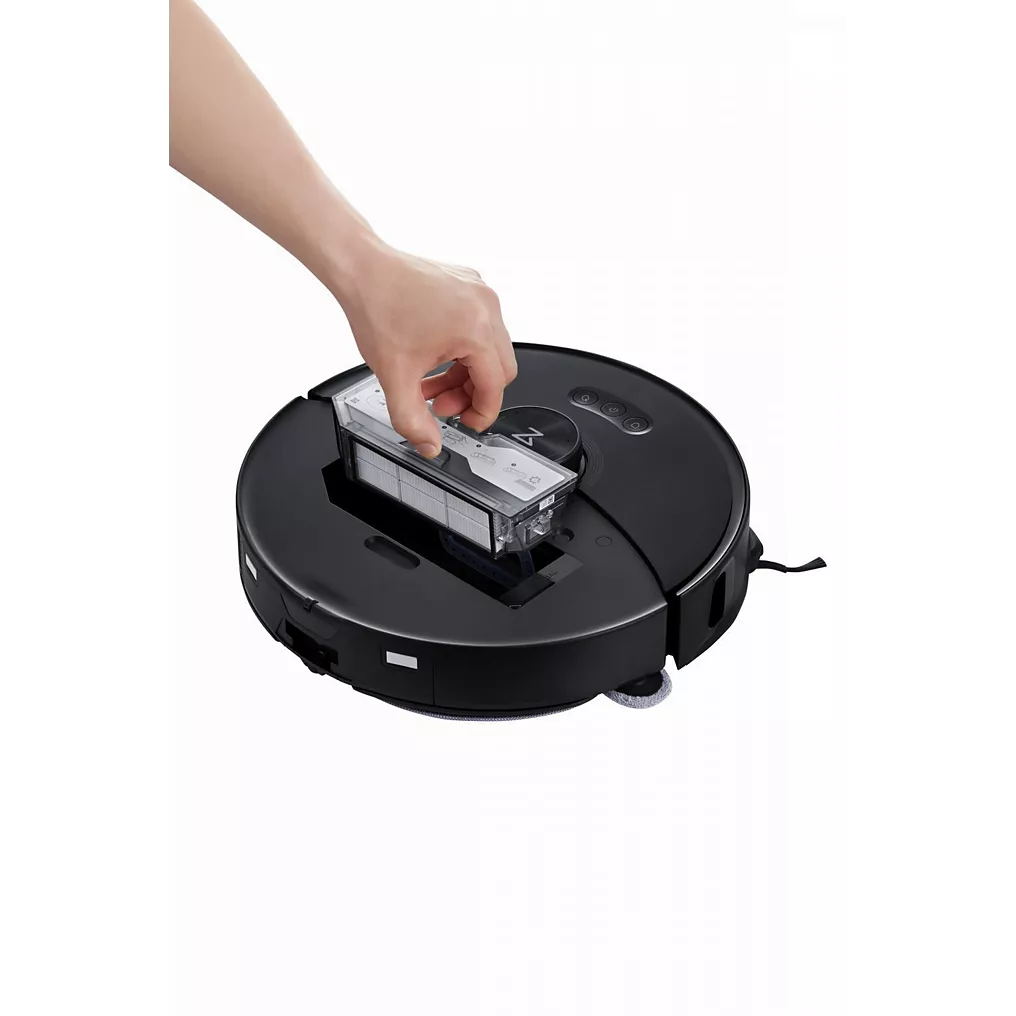 - Serpillère déportée : le robot est capable de nettoyer plus efficacement les angles et bords des murs en déployant sa serpillière vers l’extérieur.