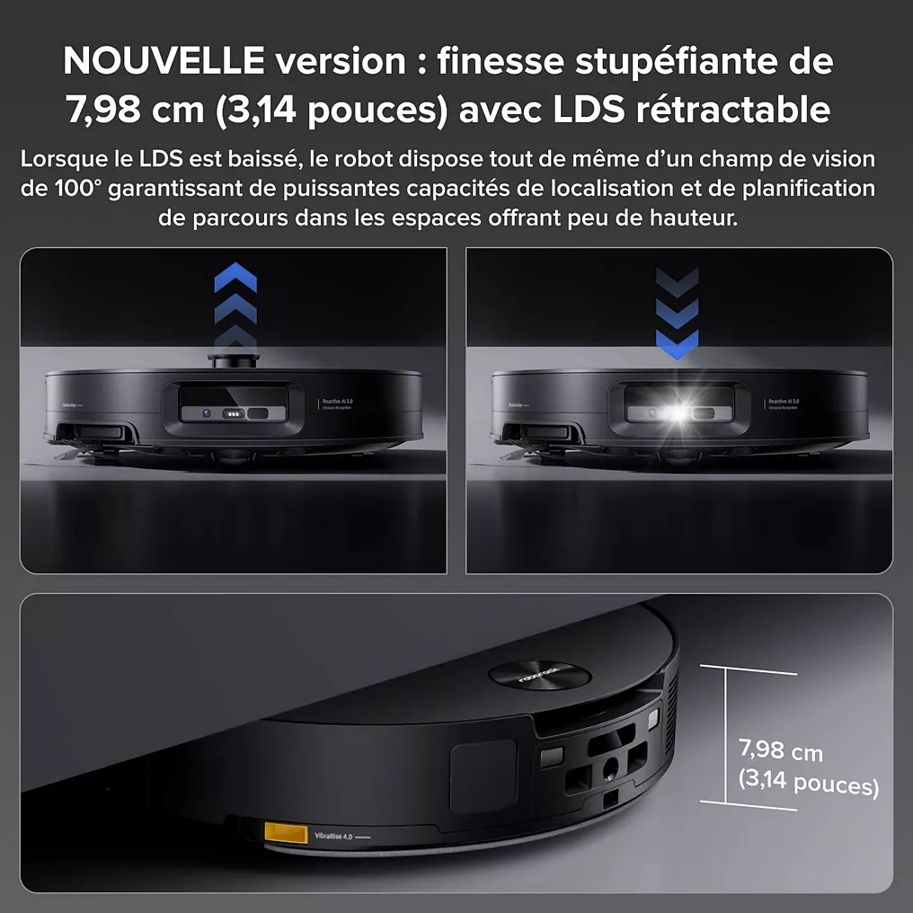 - Capteur LiDAR rétractable : le capteur LiDAR se rétracte dans le châssis du robot pour permettre à l’aspirateur de passer plus facilement sous le mobilier bas