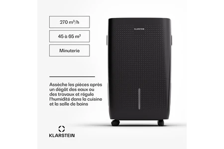Soulagement immédiat avec un taux d’humidité idéal : le déshumidificateur d’airKlarstein DryFy Connect 60 élimine l’air humide en un clin d’œil et vous permet de respirer librement dans la cuisine, la salle de bain ou la chambre à coucher, ou assure un séchage rapide après des travaux de construction ou de rénovation. Avec son débit d’air de 270 m³ par heure, il extrait de l’air jusqu’à 60 litres d’humidité par jour – ce qui fait du déshumidificateur Klarstein DryFy Connect 60 l’appareil idéal pour les pièces de 45 à 65 m². Un grand réservoir de 8 litres recueille l’eau produite. Grâce à l’interface Wifi, contrôlez facilement l’appareil avec l’application Klarstein et programmez-le avec la minuterie.