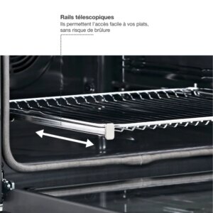 - Rails téléscopiques : ils permettent d’accéder à vos plats en les faisant coulisser en dehors de l’enceinte de cuisson en évitant les risques de basculement. Vous pourrez arroser confortablement votre rôti ou retourner facilement vos plats sans risque de brûlure.