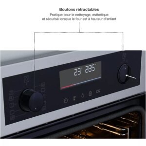- Avantage des boutons rétractables : Les commandes peuvent être rentrantes pour le côté esthétique du four, pour le nettoyage et pratique au niveau sécurité lorsque le four est à hauteur d’enfant.
