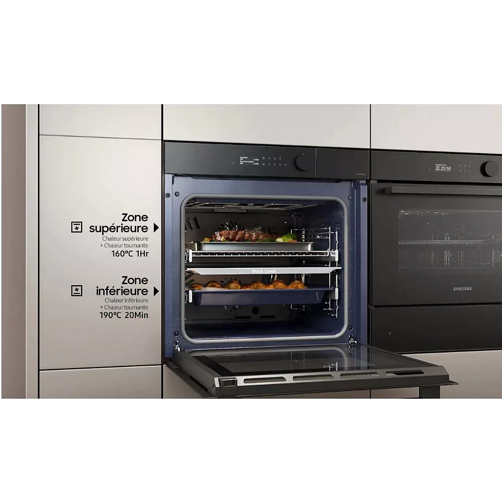 En mode Twin Convection™, il vous offre la possibilité de cuire deux plats, séparément, pour plus de flexibilité. Et si vous voulez mettre les petits plats dans les grands, utilisez les 76 litres de ce four pyrolyse Samsung en retirant tout simplement le séparateur de cavité !