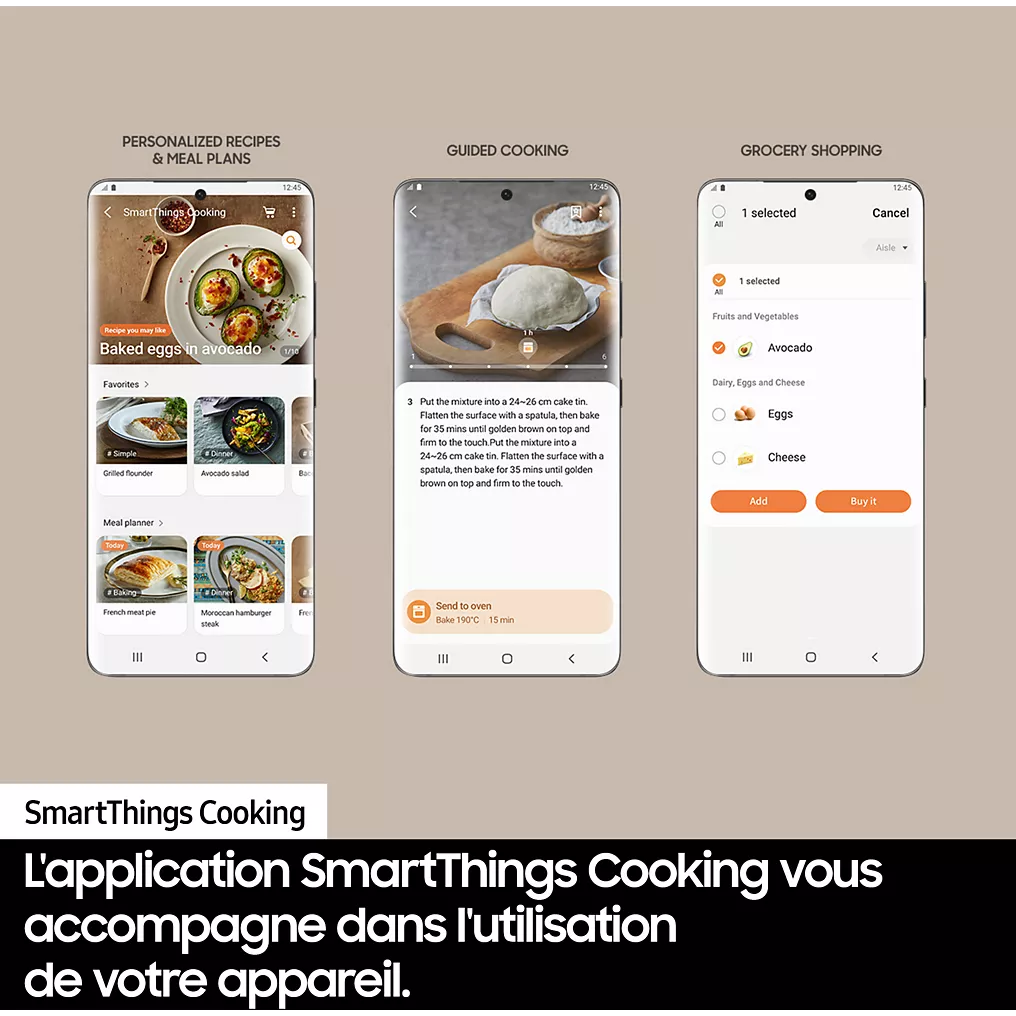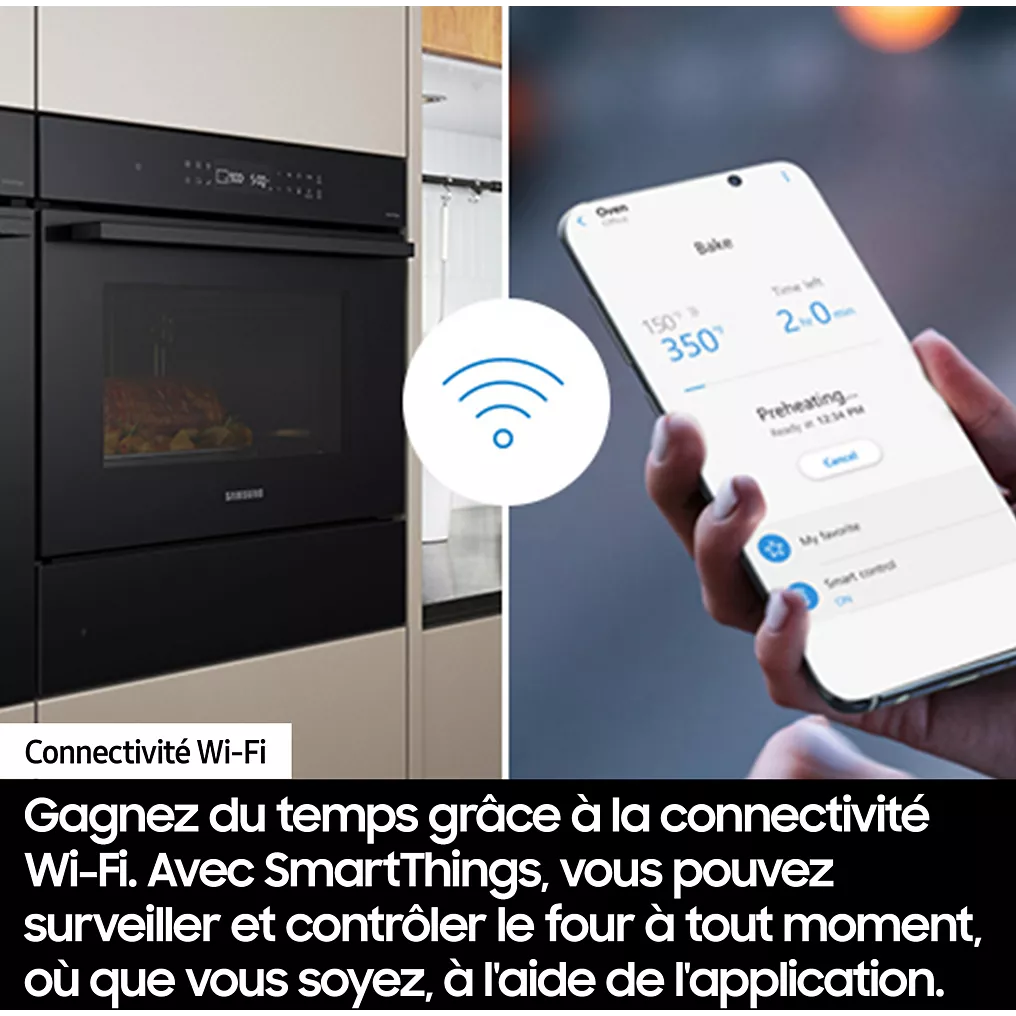 Votre smartphone, votre barre de son, votre téléviseur : tout se connecte au Wi-Fi de votre maison…et maintenant votre four ! L’application SmartThings de votre smartphone vous permet de tout faire à distance : allumer, préchauffe, éteindre, régler la température, choisir la durée de cuisson, sélectionner de réglages préprogrammés, etc. Vous avez les mains prises ? Continuez ce que vous faites, les commandes vocales Bixby et Google Assistant sont là pour vous accompagner !