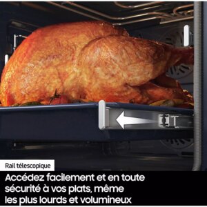 - Rails téléscopiques : ils permettent d’accéder à vos plats en les faisant coulisser en dehors de l’enceinte de cuisson en évitant les risques de basculement. Vous pourrez arroser confortablement votre rôti ou retourner facilement vos plats sans risque de brûlure.