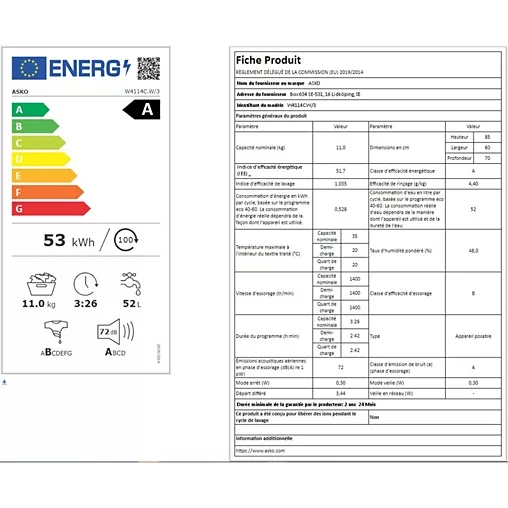 - Consommation d’électricité pour 100 cycles (programme éco) : 53,0 kW