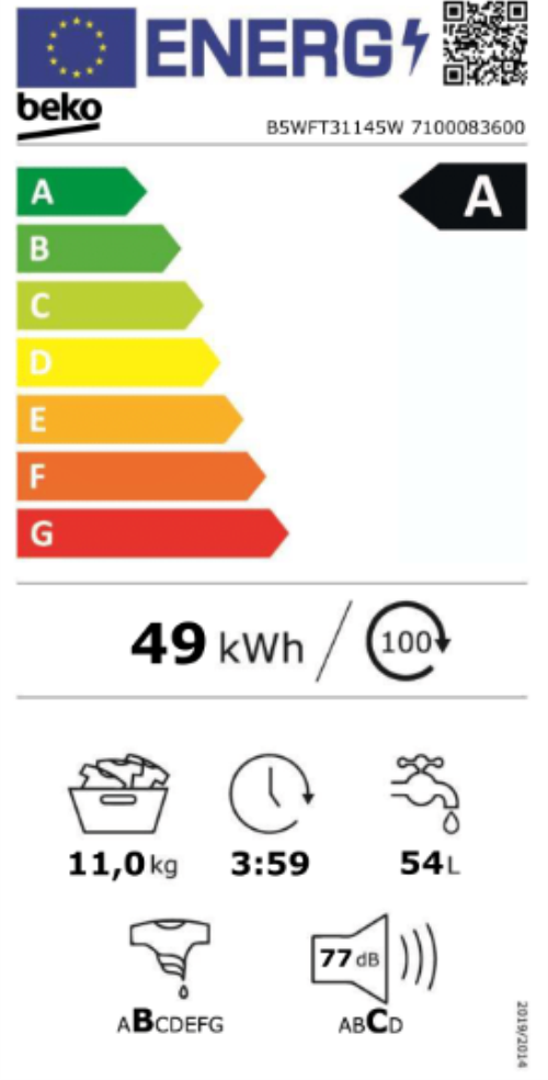 • Niveau sonore en décibels max. en essorage : standard (77 db)
