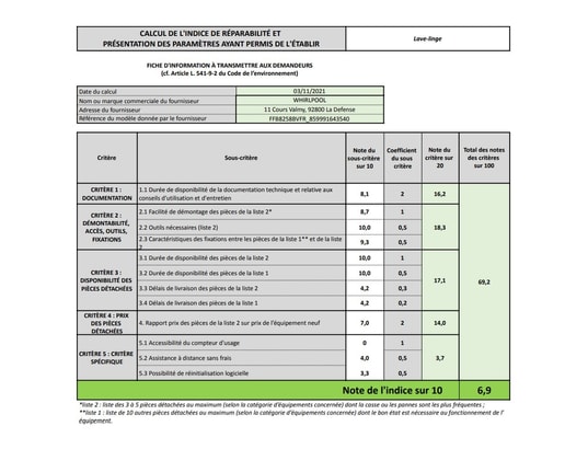 - Disponibilité des pièces détachées (données fournisseur) : Pendant 14 ans, à compter de la date fin de fabrication