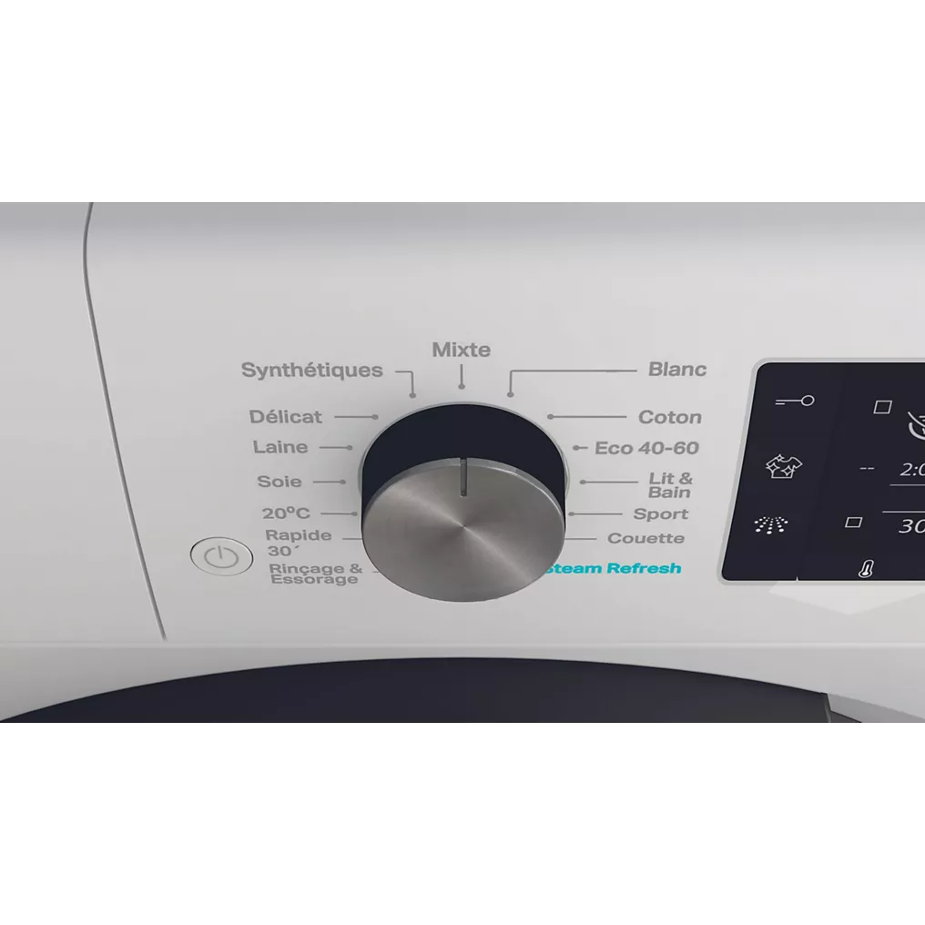 - Défroissage vapeur : oui, il agit en fin du cycle de lavage en adoucissant et défroissant votre linge