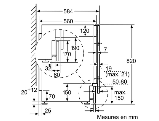 - Notre conseil : prévoir 2 à 3 centimètres supplémentaires derrière la machine pour le passage des tuyaux et câbles.
