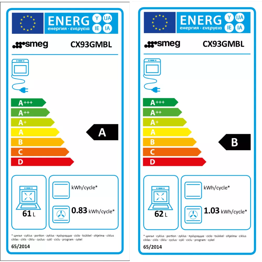 - Valeurs du label énergie : Label énergie A, Consommation en convection naturelle 1,03 kW, Consommation en chaleur tournante 0,83 kW