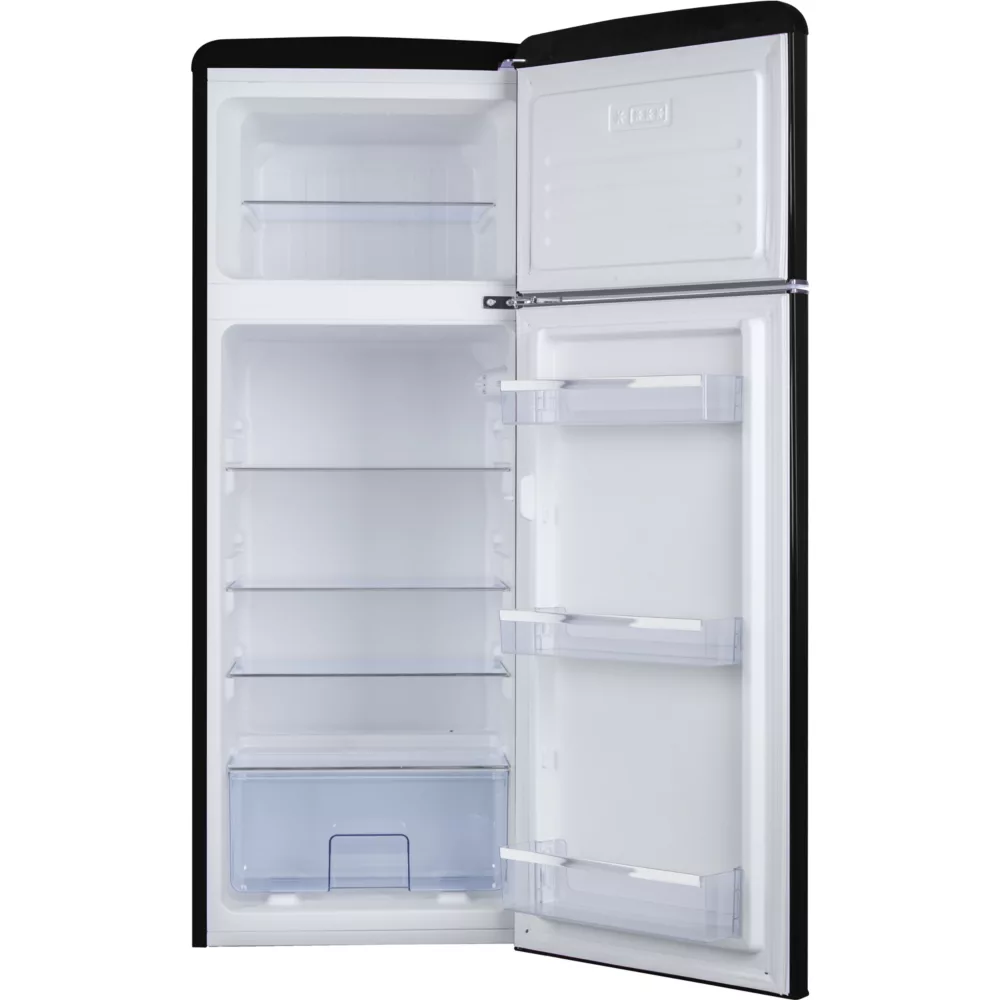 Le Réfrigérateur AMICA AR7252N, avec son esthétique rétro et sa finition noire élégante, s’intègre parfaitement dans toute cuisine moderne ou traditionnelle. Offrant un volume utile total de 246 L, cet appareil pose libre est idéal pour les foyers recherchant à la fois style et fonctionnalité. Le réfrigérateur propose un espace généreux de 194 L, équipé de 3 clayettes en verre à finition silver, 3 balconnets, un bac à légumes et un support à oeufs, tous conçus pour une organisation et un accès facile à vos aliments. L’éclairage LED assure une visibilité parfaite tandis que le thermostat mécanique permet un contrôle aisé de la température.