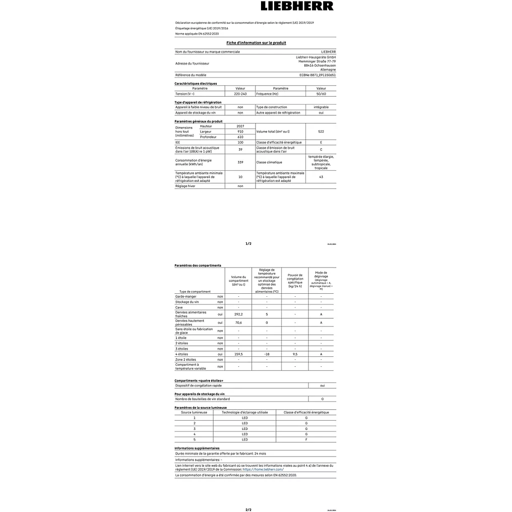 • Consommation d’énergie annuelle : 339,0 kWh/an