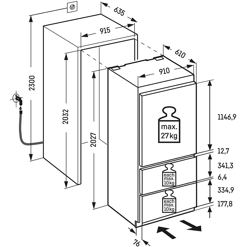 • Dimensions d’encastrement l x h x p : 91.5 x 203.2 x 63.5 cm