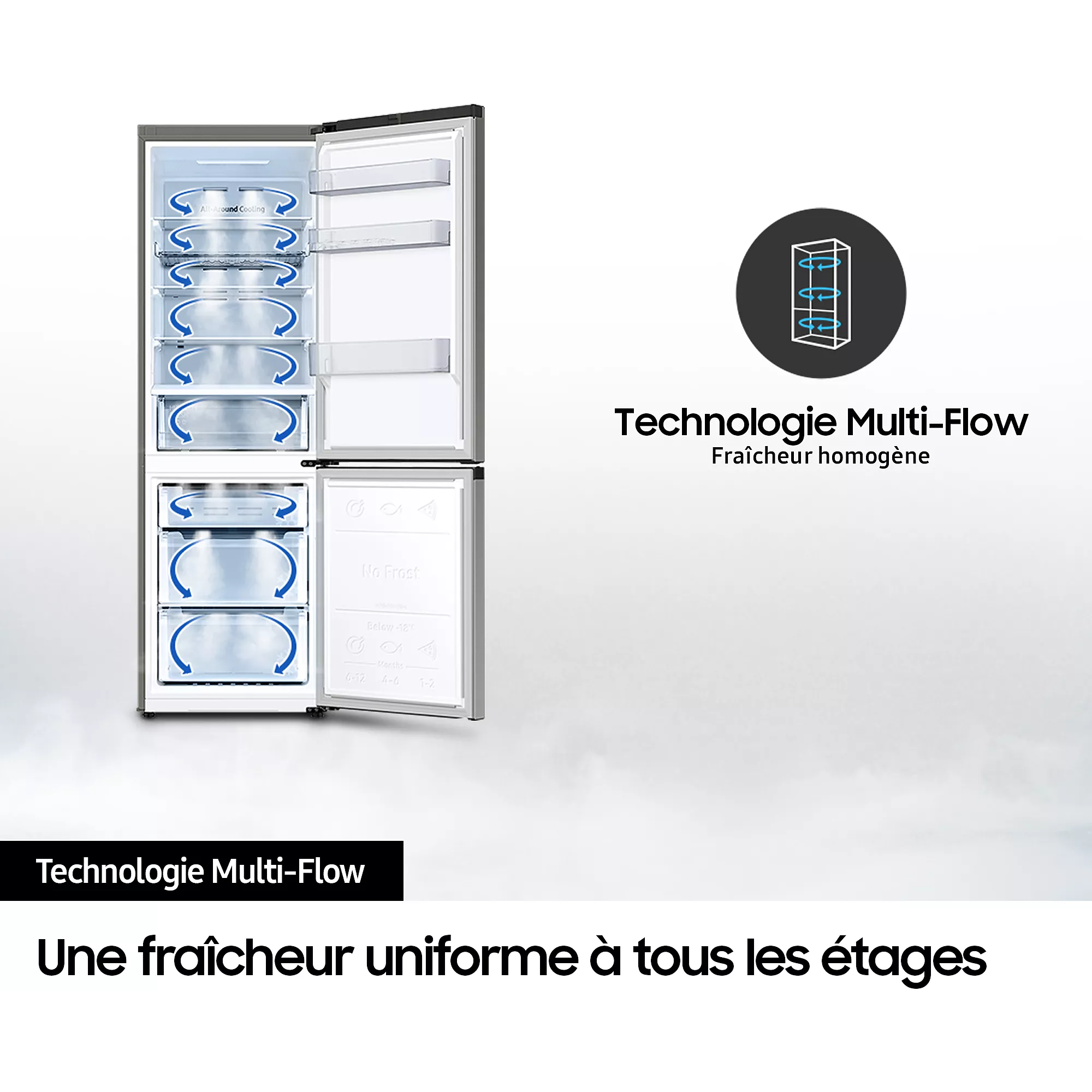 - Froid du réfrigérateur : le froid ventilé permet une répartition du froid de manière homogène et un rangement libre, sans contrainte, des aliments dans le réfrigérateur