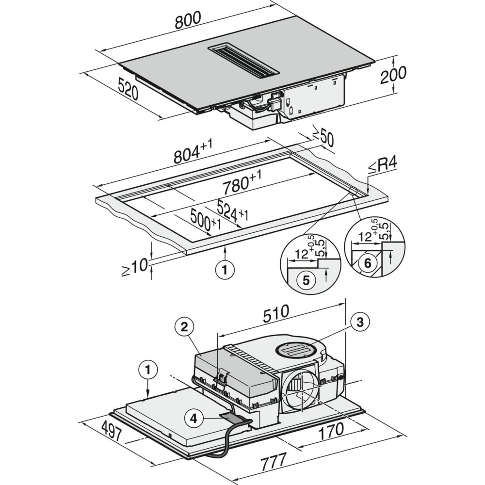 - Type de table : induction avec hotte intégrée, solution pratique et esthétique pour combiner la table de cuisson et la hotte. Elle nécessite un encastrement spécifique (voir infos dimensions).